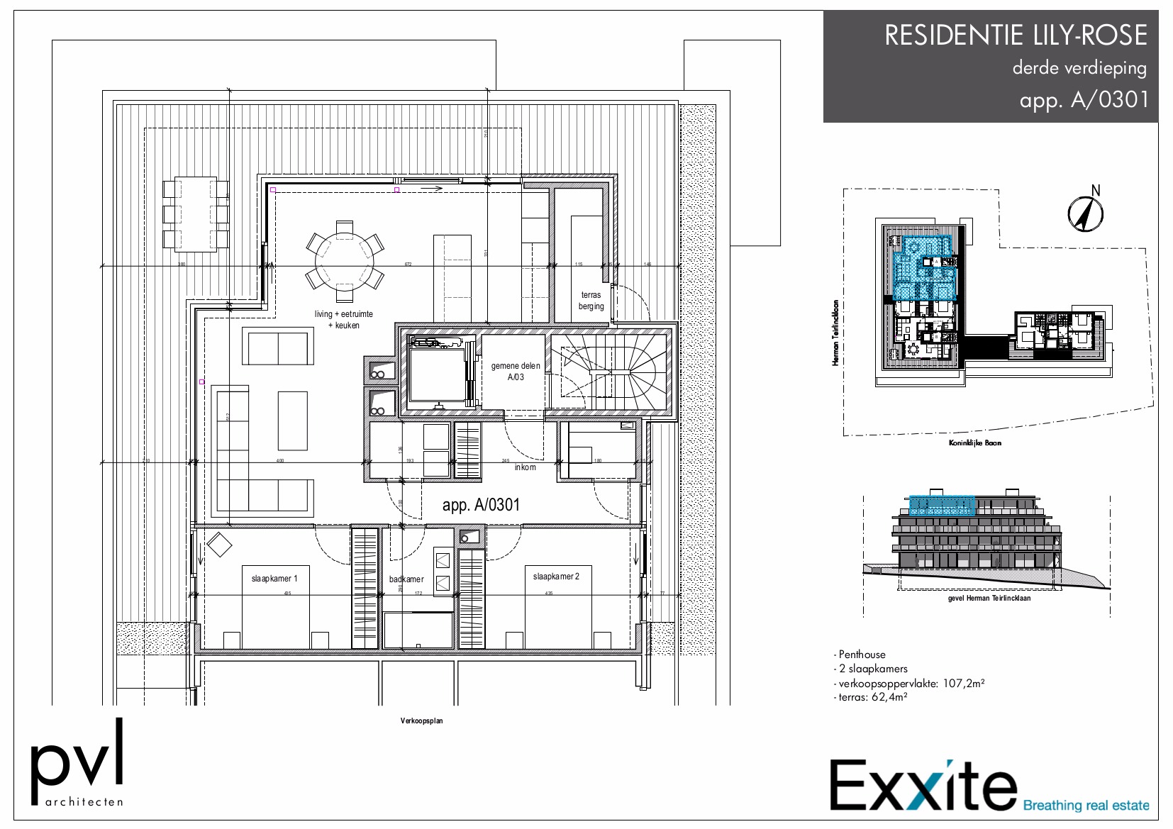 Ce penthouse dispose d’une salle de séjour et cuisine ouverte avec de grandes baies vitrées. Il y a deux grandes chambres et une salle de bains moderne. Depuis la terrasse orientée sud-ouest de ce penthouse luxueus, vous avez une belle vue et vous pourrez profiter de la tranquillité. Chaque appartement dispose d’une cave privée. Il y a la possibilité d’acheter un parking dans l’immeuble. La résidence de Lily-Rose est à 100 mètres de la plage et de la mer.